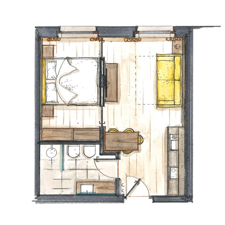 - Boxspring bed for heavenly sleep quality, separated from the living room by a sliding door