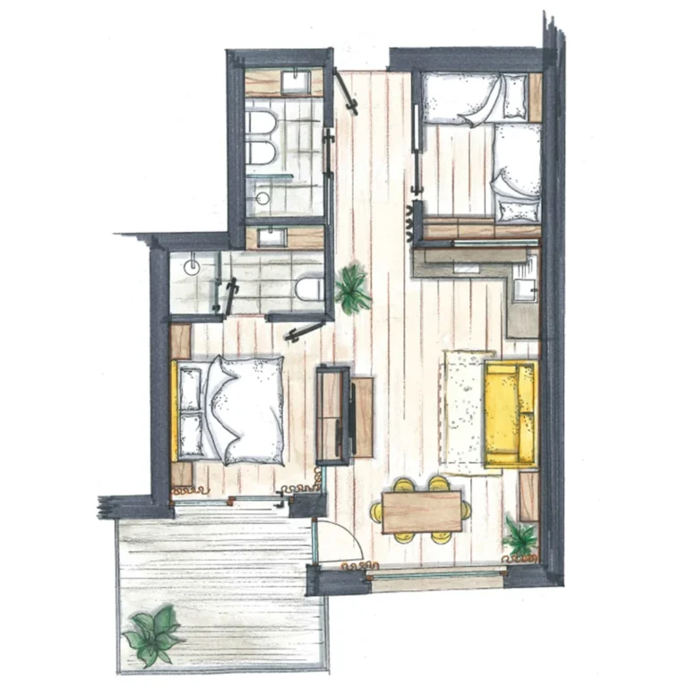 Questo appartamento offre tanto spazio per famiglie fino a 6 persone. Si compone di una camera matrimoniale, una camera con due letti singoli, 2 bagni e una cucina-soggiorno completamente attrezzata. L’highlight in più: una loggia coperta rivolta a sud con tavolo da pranzo.