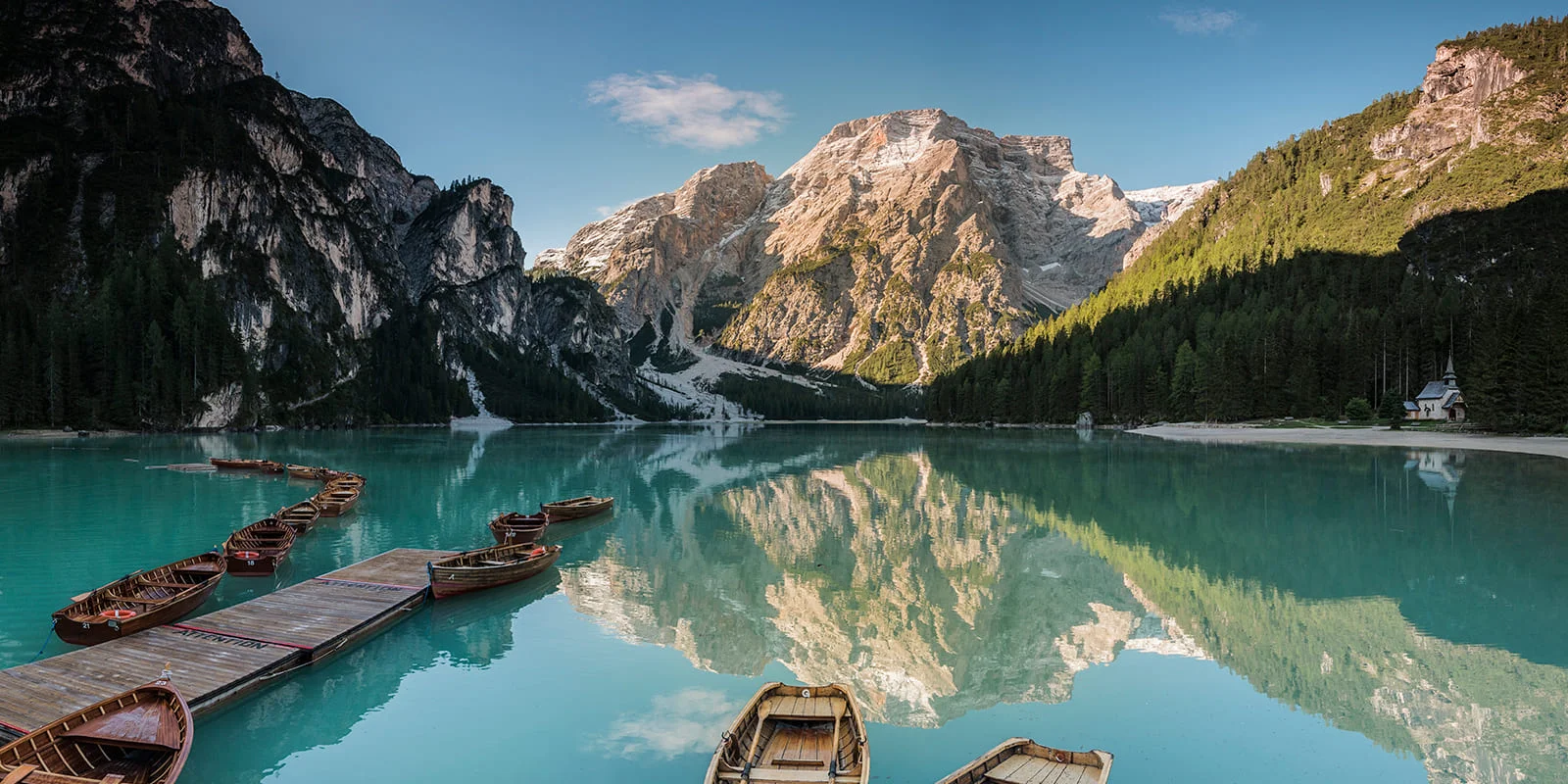 Sich im türkisfarbenen Wasser des Pragser Wildsees inmitten der Dolomiten spiegeln.
